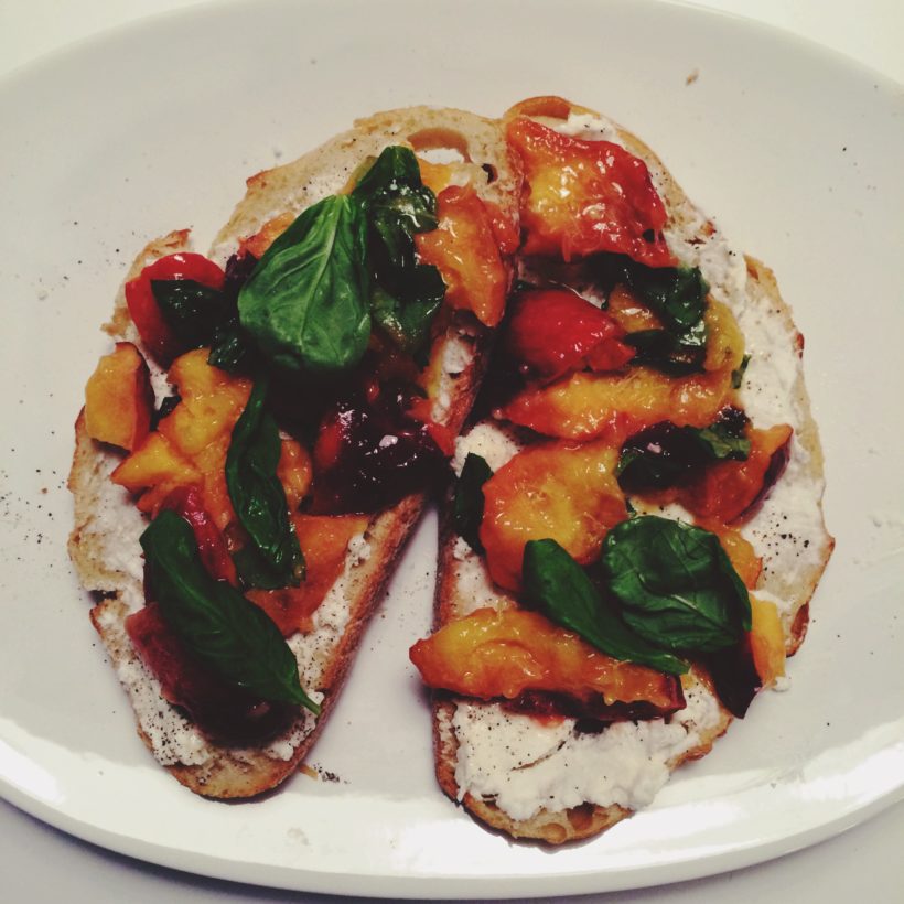 Est-ce la grève des fourneaux chez vous? Avouez qu’avec tous les bons produits qui commencent leur parade dans les marchés, on a seulement le goût de cuisiner frais, simple et savoureux. Pour moi, ça veut souvent dire des tartines, comme celle que le partage avec vous aujourd’hui. Elle met en accord un de mes duos préférés, soit la pêche et le basilic. Le tout sur un bon ricotta crémeux et du pain frais frotté d’ail, question de compléter le repas.